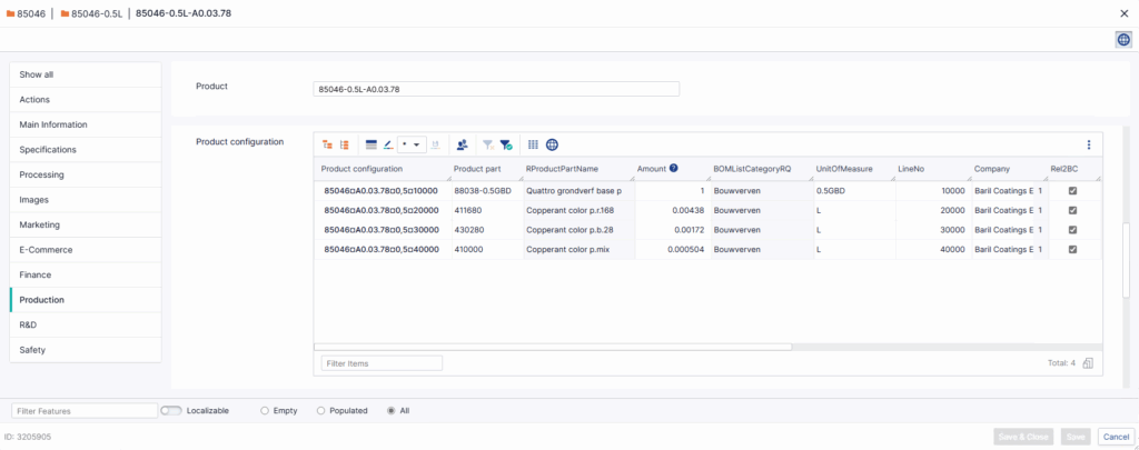 - Only production-relevant data are transferred from Perfion to Business Central’s BOM.